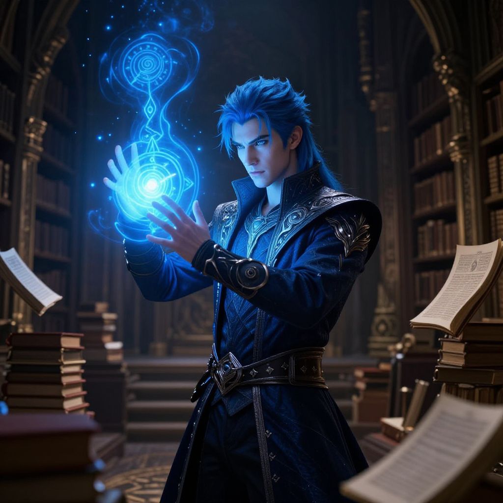 Blue hair characters male as a mysterious sorcerer, casting a glowing blue spell in a dark ancient library filled with floating books and arcane symbols, dramatic lighting highlighting ethereal effects, intricate costume details.