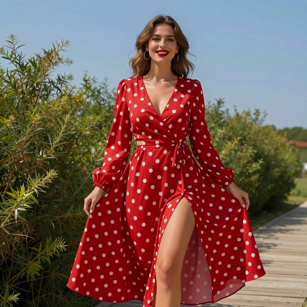 Blonde Woman in Pink Polka Dot Dress Sitting on Steps