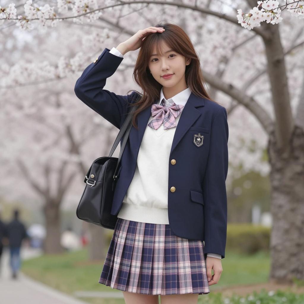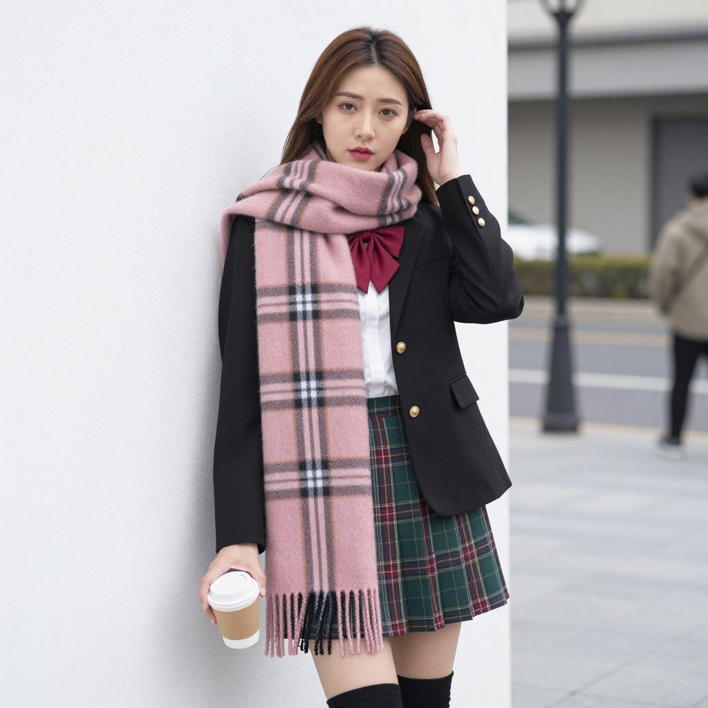 Asian woman with long brown hair, wearing a black blazer, pink plaid scarf, red bow tie, and green plaid skirt, holding a disposable coffee cup in her right hand. She stands against a white wall, slightly leaning with her left hand touching her hair. Background includes a blurry street with a lamp and another person. She has a neutral expression. Textured scarf with fringes. Black thigh-high socks. Urban setting.