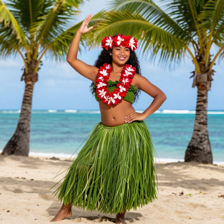 A vibrant Hawaiian hula girl with a sun-bronzed complexion, full lips, and a radiant smile, performing in a traditional pose on a sandy beach with a turquoise sea behind her, wearing a vibrant green grass skirt and a large red and white lei, surrounded by coconut trees and bright tropical flowers, rich in cultural detail, natural photorealistic style.