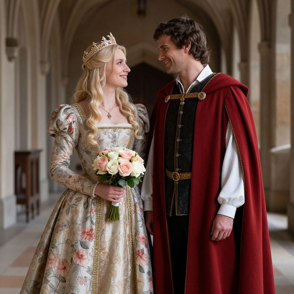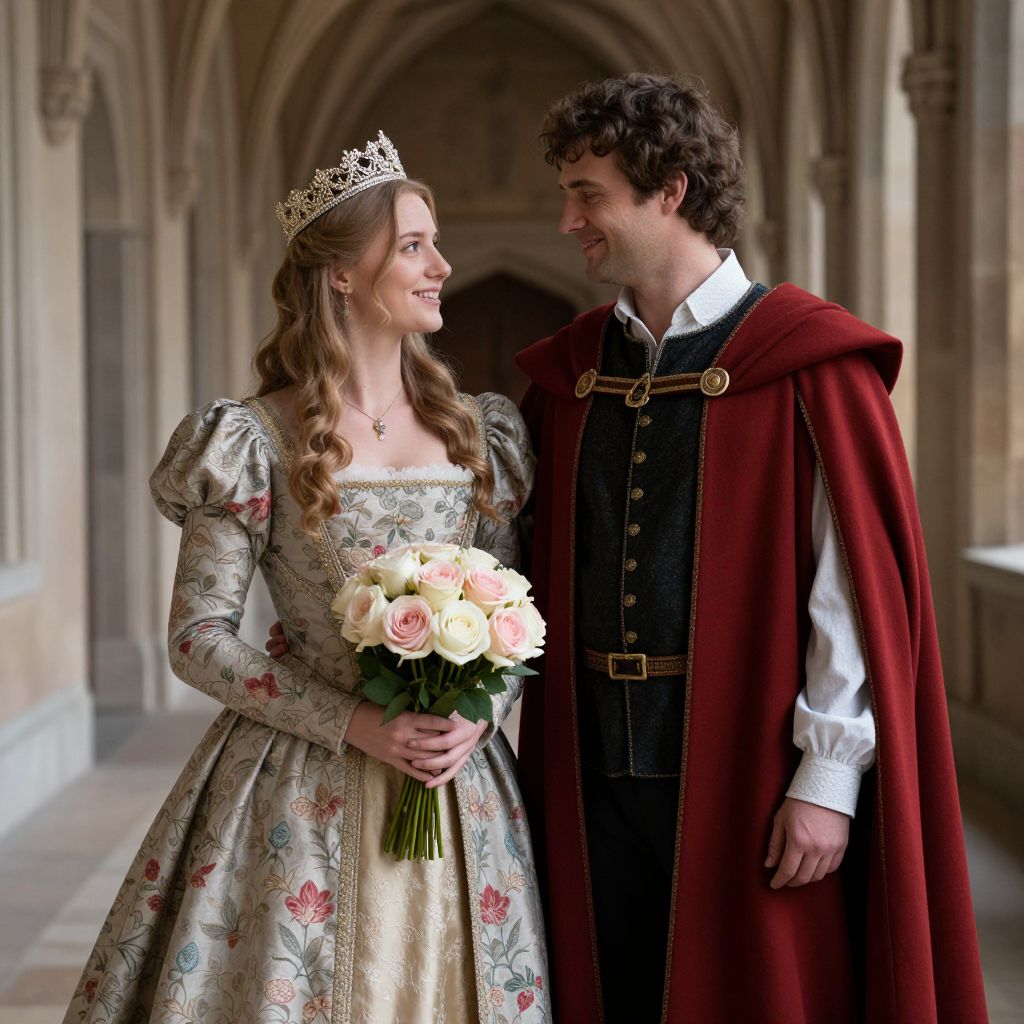 Elegantly dressed medieval couple stands in a grand hallway, the woman wearing a floral-patterned gown and crown while holding a bouquet of soft pink and white roses, and the man donning a regal red cloak over a dark vest and white shirt, both smiling warmly at each other.