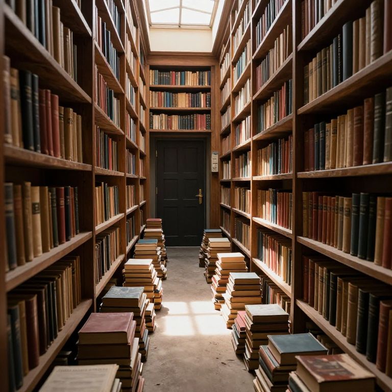 Photograph of a narrow library aisle with tall wooden bookshelves on both sides, packed with variously colored books. The shelves are uniformly aligned, creating a symmetrical pattern. Stacks of books are neatly arranged on the floor in the center aisle, leading to a closed black door at the far end. The ceiling has large, translucent windows allowing natural light to illuminate the space, casting soft shadows. The overall atmosphere is quiet and scholarly, with a warm, brown-toned palette. The floor is made of polished concrete, adding to the library's classic, academic ambiance.
