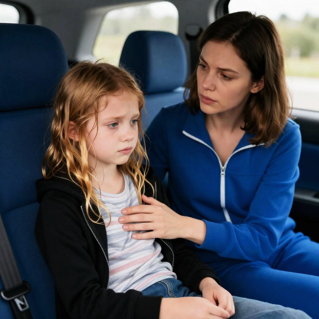 Photograph of two people in a car. A woman with shoulder-length brown hair, wearing a blue tracksuit, gently holds a distressed girl with wet, blonde, wavy hair, wearing a striped shirt and black jacket, on the car seat. The girl looks down with a sad expression. The woman looks at the girl with concern. Blue car seats in the background.