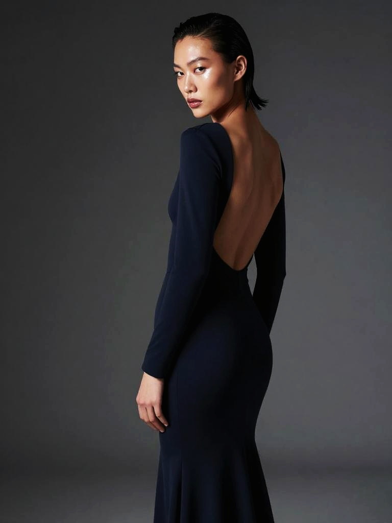 Transgender model, high-fashion studio portrait, trans feminine model with smooth skin and sculpted cheekbones turned three-quarters to camera, wearing a midnight navy sleek backless gown with long sleeves, sharp cheekbones highlighted by dramatic beauty lighting, subtle glossy makeup, minimalist styling, dark gray gradient backdrop, editorial fashion photography, ultra-detailed, high resolution