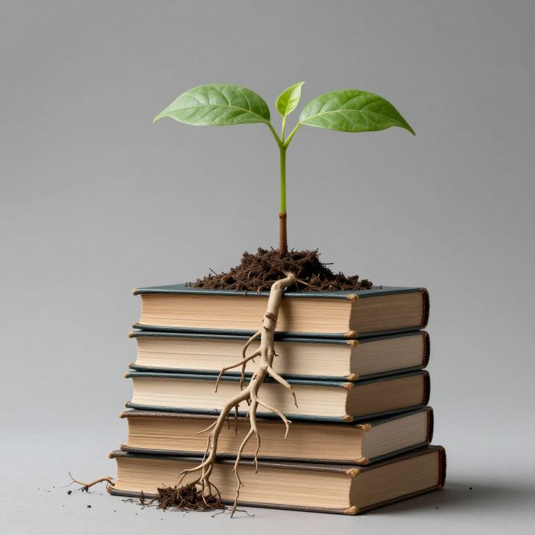 Photograph of a small green plant with two leaves sprouting from a soil-covered stack of five hardcover books, each with beige covers and dark green spines. The plant's thin, brown roots extend downward through the soil, which is piled on top of the books. The background is a simple, gradient gray, with the stack and plant positioned centrally. The image symbolizes growth and knowledge, with the plant emerging from the books. The texture of the soil is rough, contrasting with the smooth book covers and the delicate, veined leaves.