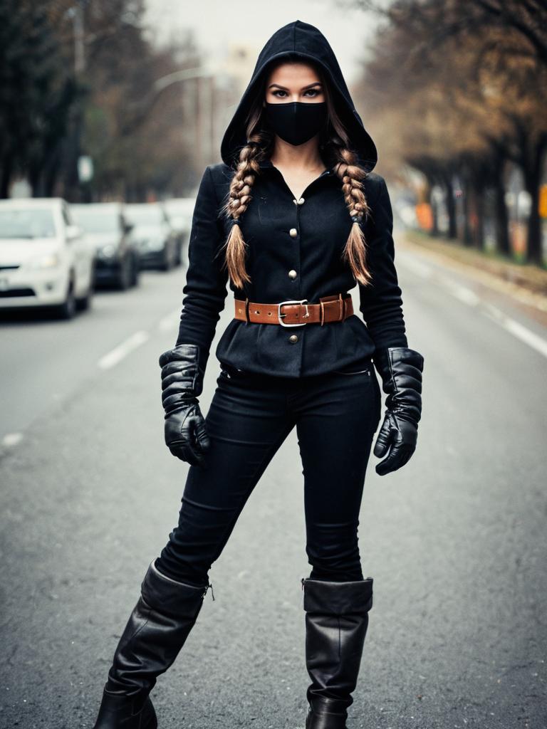 Gloves fashion costume, 1girl, gloves, belt, blurry background, blurry, solo focus, hood, mask, outdoors, street, boots, road, looking at viewer, brown hair, long hair, braid, standing, black gloves, hood up, pants
