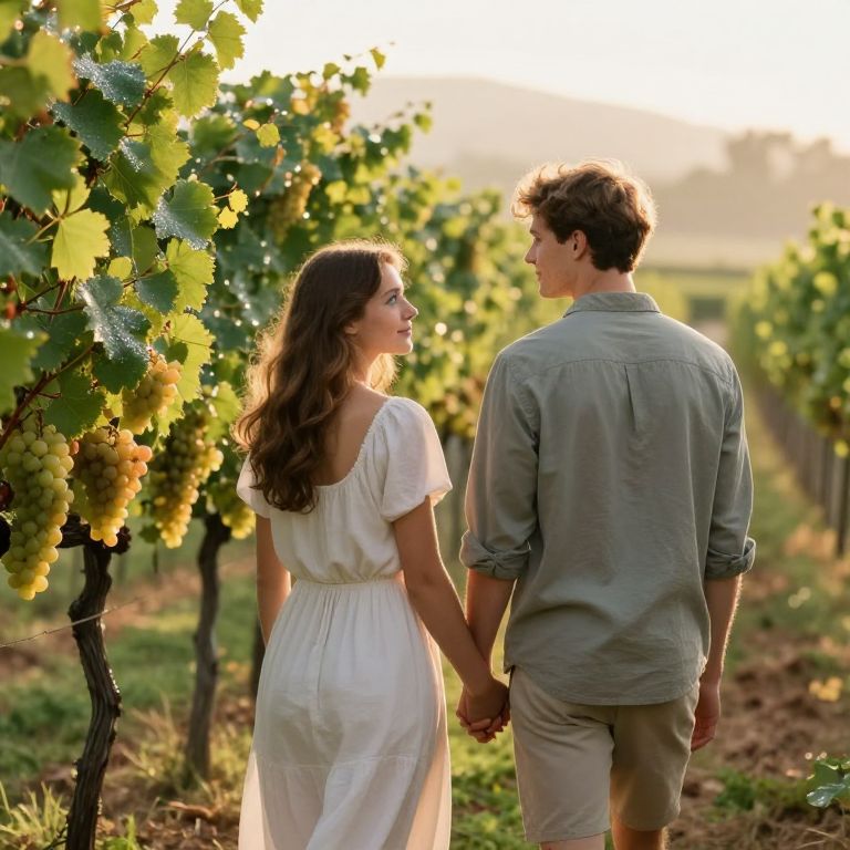 A peaceful morning in a sunlit vineyard backdrop with dew-covered leaves and clusters of ripe grapes hanging low among trained grapevine trellises. A young couple with soft blue eyes and fair skin walks slowly along a dirt path, their backs to the camera, hands clasped, looking into the distance with quiet joy.