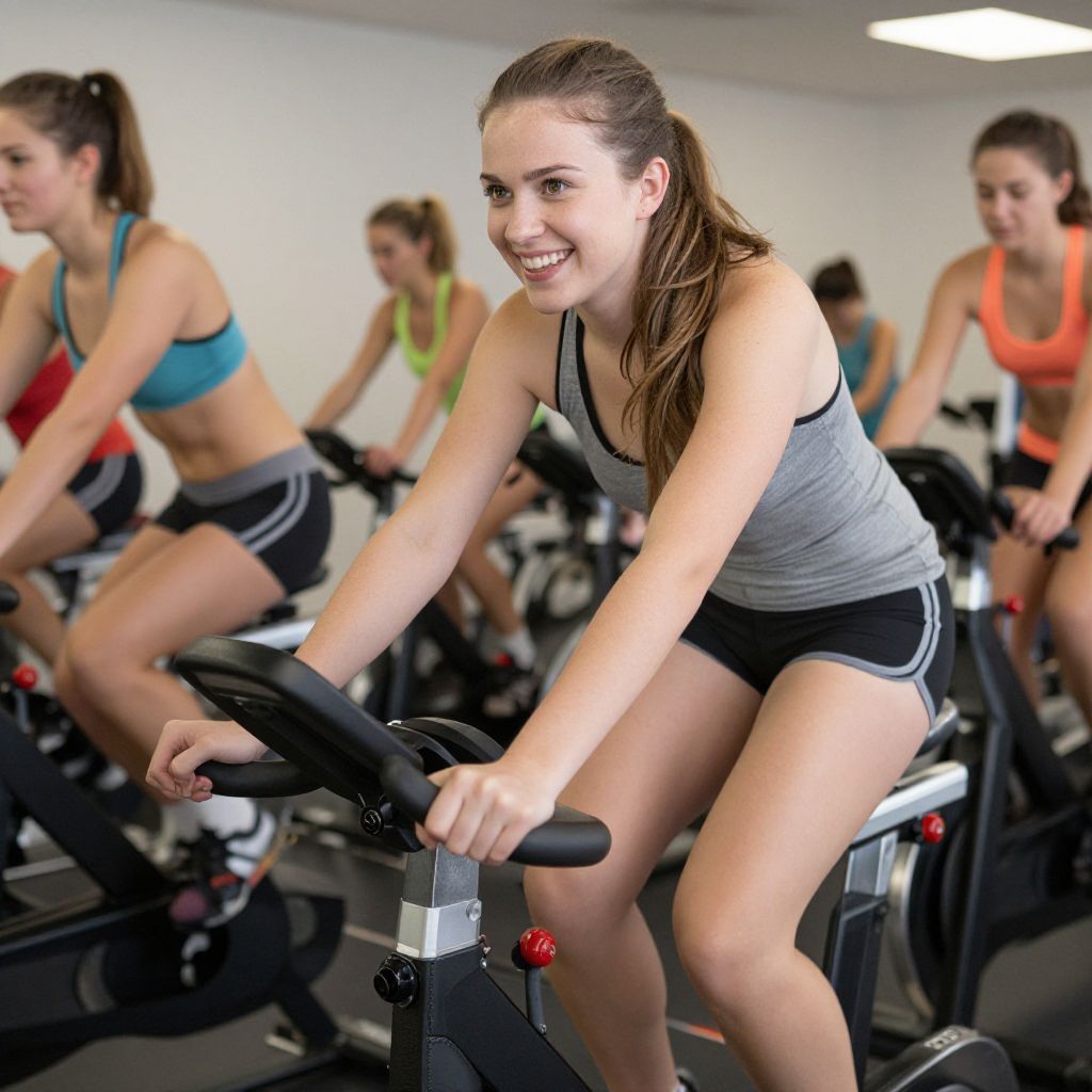 Young woman smiling brightly while cycling on a stationary bike during a spin class, surrounded by other participants in a well-lit gym setting.