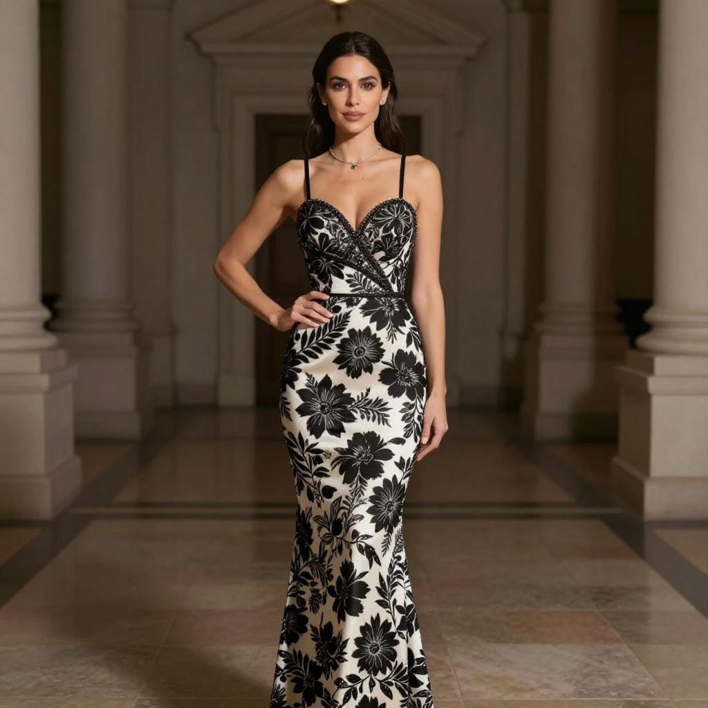 Photograph of a woman with long, wavy brown hair, wearing a vibrant, one-shoulder, floor-length blue gown. She stands confidently in an opulent, dimly lit hall with ornate, golden decorations and polished wooden floors. Her right hand rests on her hip, and her left hand touches her hair.