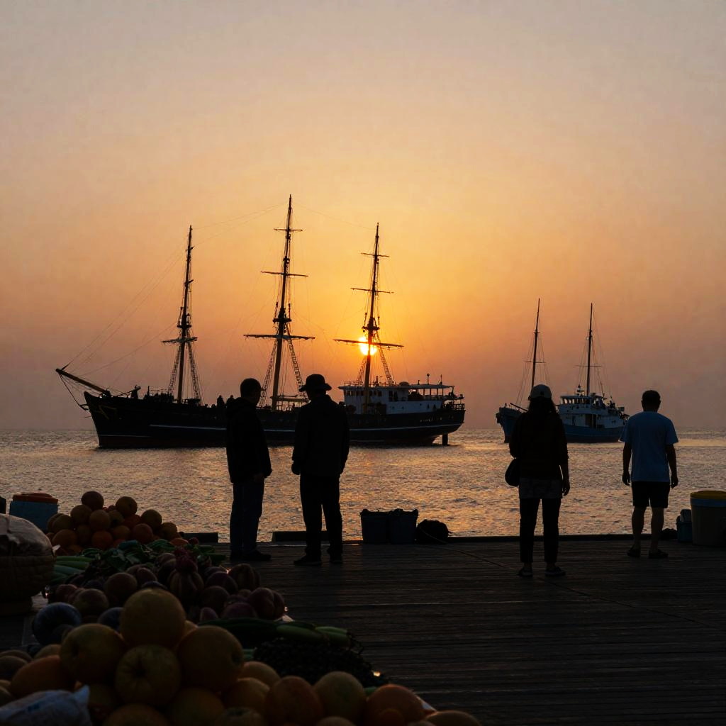 Photograph of a dark, moody seascape at dusk. Silhouetted against a cloudy sky, three boats with tall masts float on shimmering, reflective water. The boat on the right is more distant, creating a sense of depth. The water's surface sparkles with sunlight.