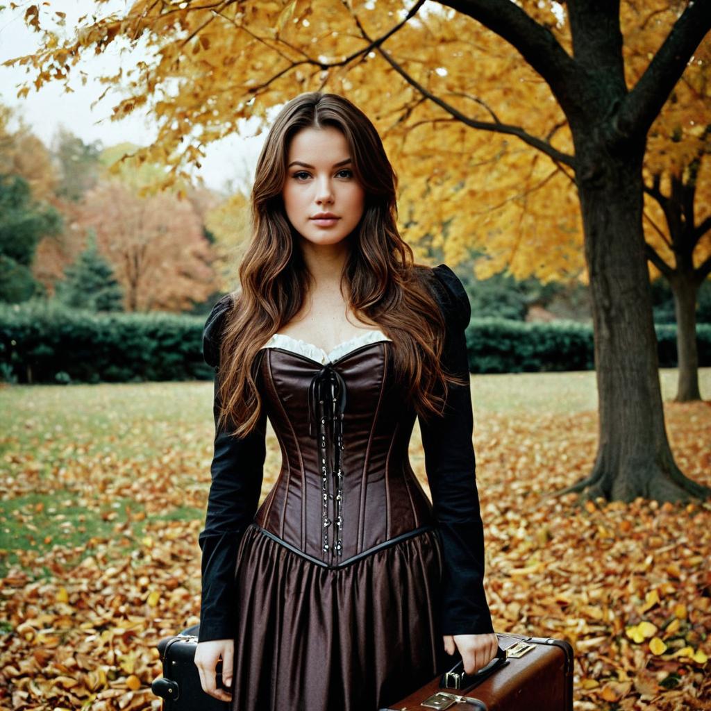 A young woman with long brown hair and brown eyes stands outdoors in an autumn park covered with fallen leaves. She wears a vintage-style brown corset dress with long sleeves and holds a brown suitcase. The background features trees with yellow autumn foliage, creating a warm seasonal atmosphere. The woman looks directly at the viewer with a calm expression and has freckles on her face.