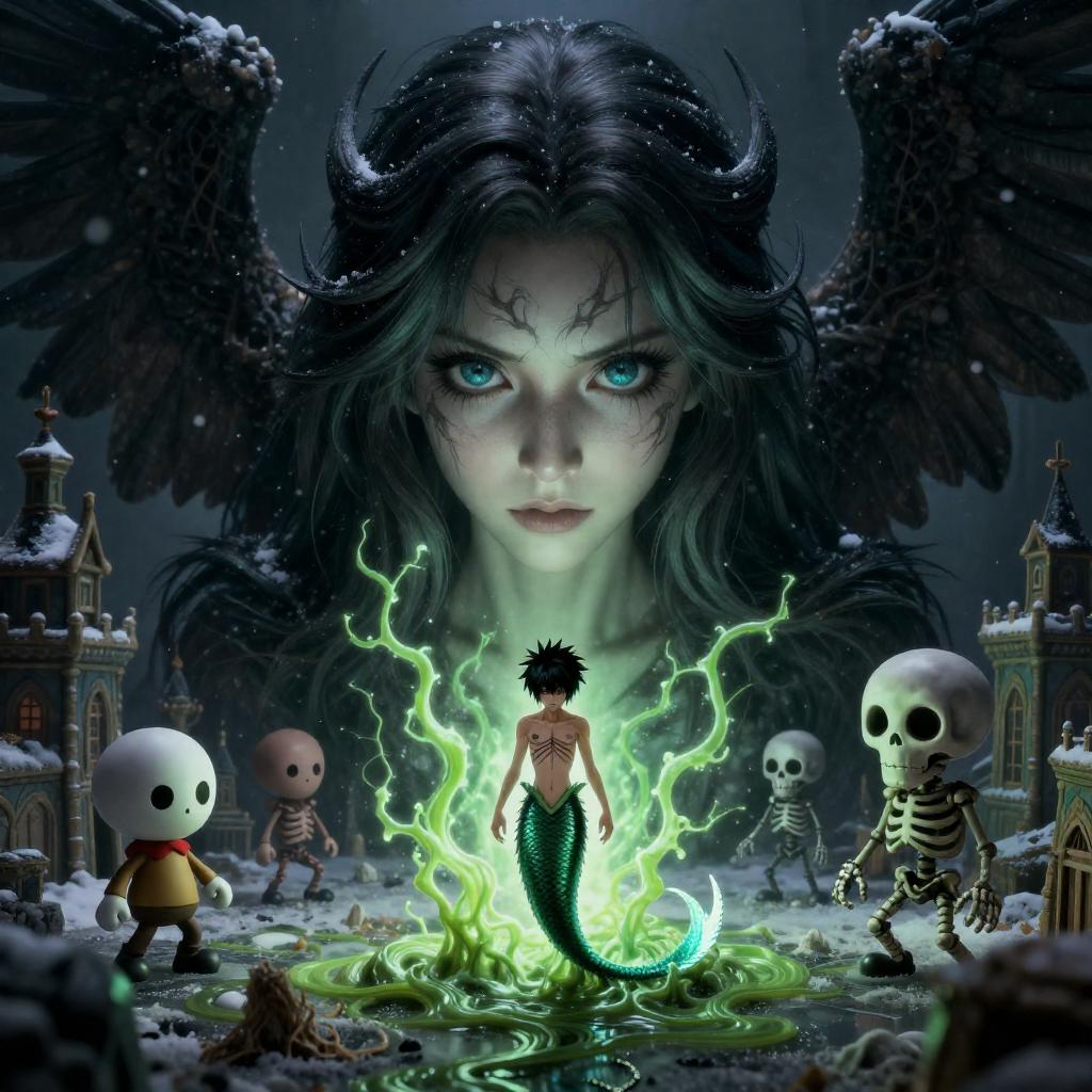 A highly detailed digital artwork depicting a mystical mermaid figure with a green scaly tail and glowing green magic surrounding them. In the foreground are stylized skeleton characters reminiscent of Undertale, set against a dark gothic fantasy background with snow and intricate fantasy buildings. Behind the mermaid is a large ethereal female figure with striking blue eyes and dark wings, adding a dramatic and surreal atmosphere. The scene features volumetric and rim lighting effects, a dark magical aura, and intricate textured details.