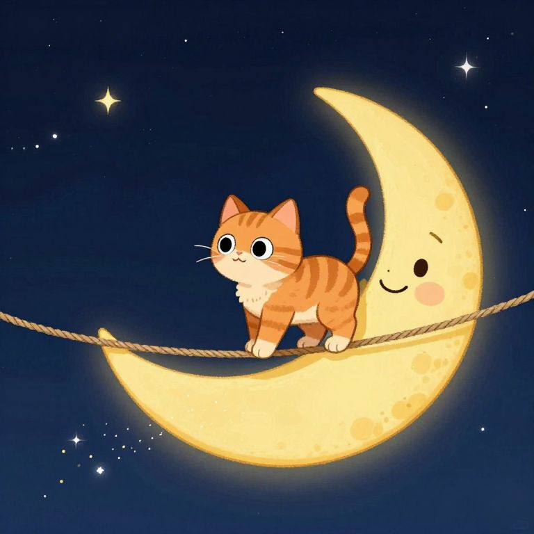 In a whimsical cartoon-style illustration, a ginger cat with expressive eyes balances gracefully on a rope stretched across a smiling crescent moon, leaving a trail of stardust against a starry night sky.
