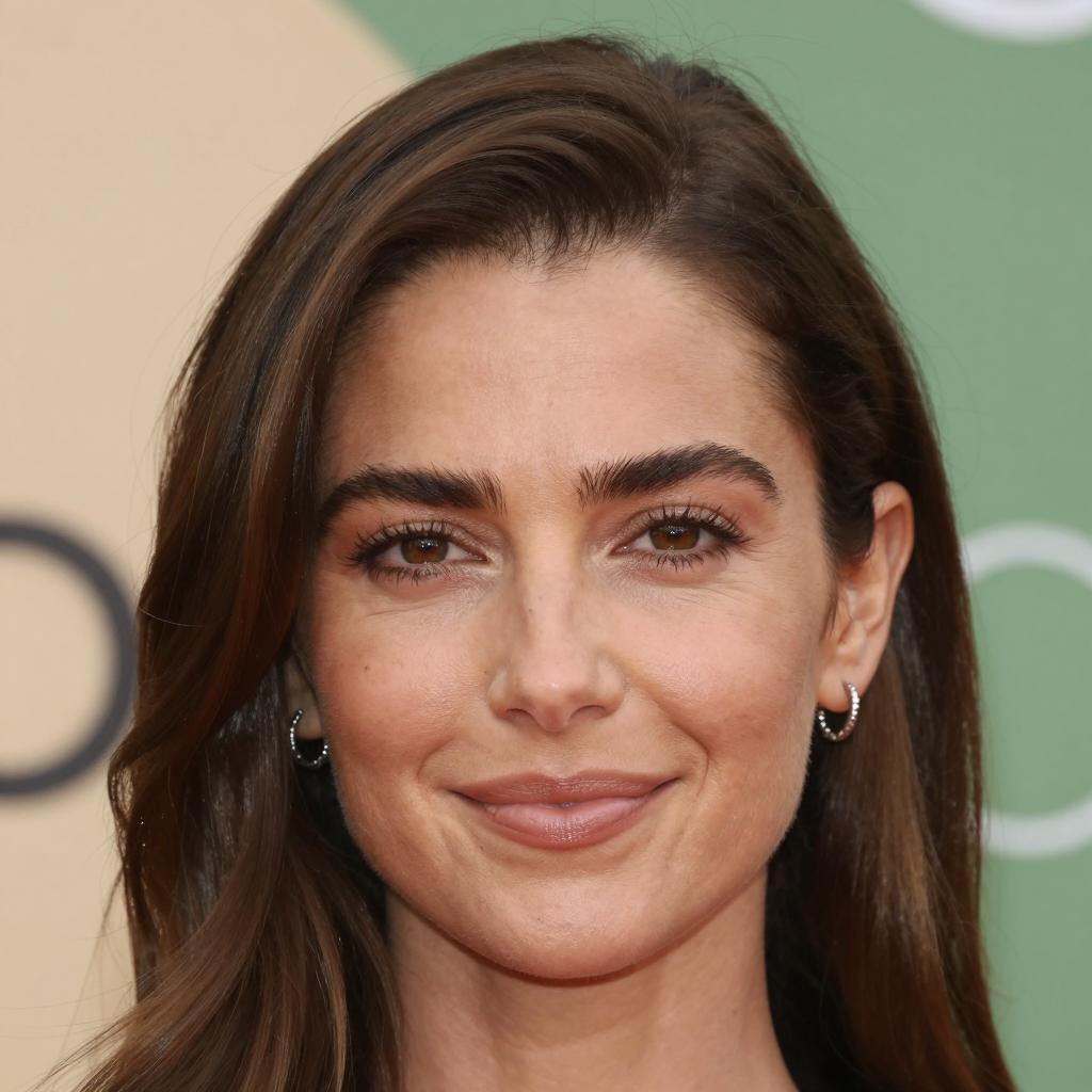 A smiling woman with curly, light brown hair, wearing a black jacket with a white collar. She has blue earrings, red lipstick, and is looking slightly to the right. Bright red background on the left, dark background on the right. Her eyes are light brown. She is raising her right hand.