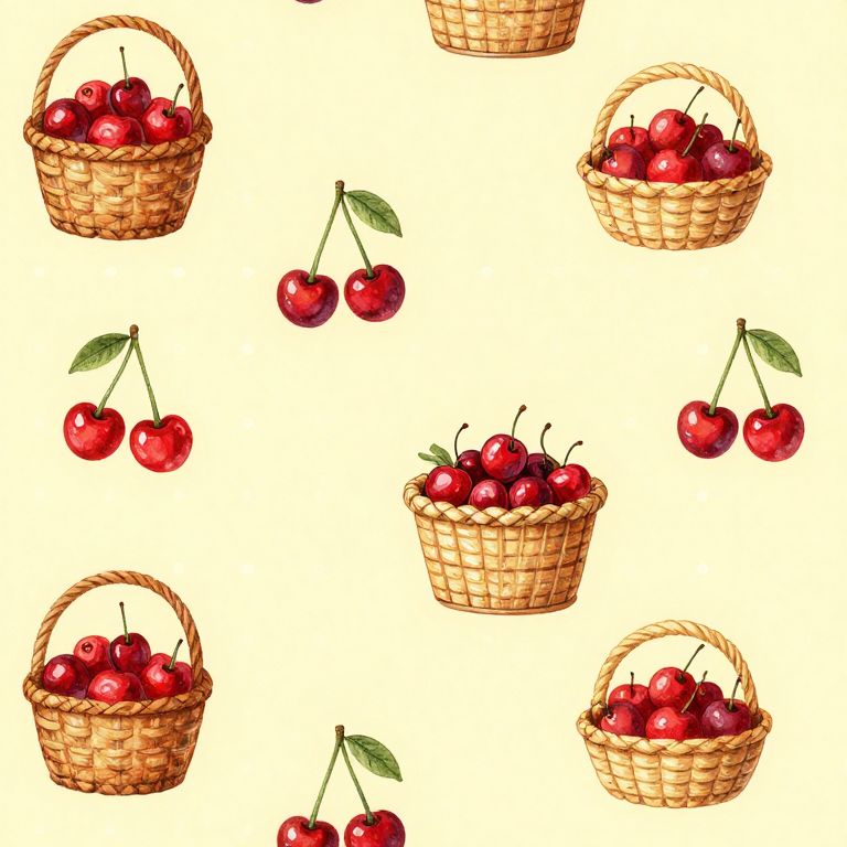 This is a digital illustration featuring a repetitive pattern of woven baskets filled with shiny red cherries, and single cherry pairs with green leaves. The baskets are evenly spaced, with some filled to the brim and others with a few more cherries. The cherries are depicted with a glossy, realistic texture, and the baskets have a detailed, woven texture. The background is a plain, off-white color, making the red cherries and baskets stand out prominently. The style is reminiscent of watercolor with vibrant colors and slight shading for depth. The overall pattern is symmetrical and visually appealing.