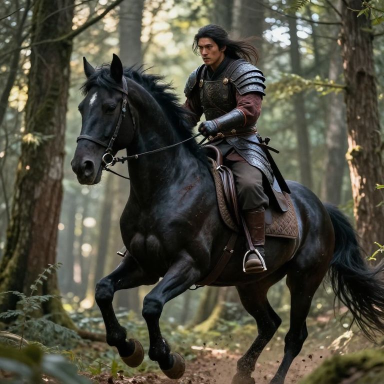 A fierce warrior with long hair riding a majestic black horse through a dense forest, dressed in leather armor with battle scars, morning light filtering through the trees, highly detailed, action scene