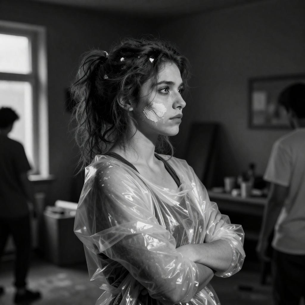 Black-and-white photograph of a woman with messy hair, smeared with white paint, arms wrapped in clear plastic, profile view, intense expression. Background includes a dark, cluttered room with a partially visible window. Two people partially visible.