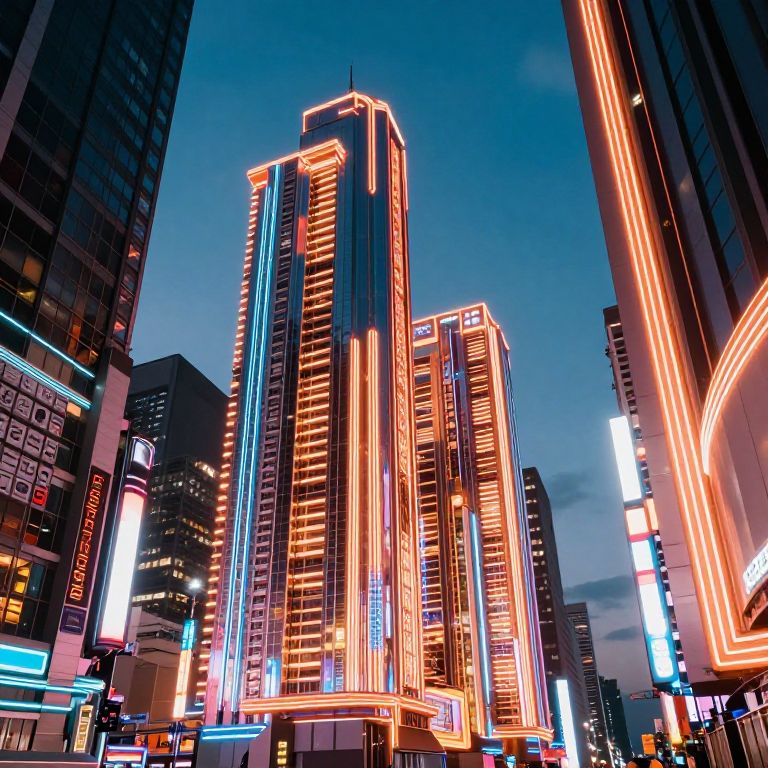 Neons height contrasted against a twilight sky, enormous neon billboards and towering light structures forming a luminous labyrinth, blend of glowing warm and cool tones, bustling futuristic city environment, intricate light patterns creating a mesmerizing vertical composition.