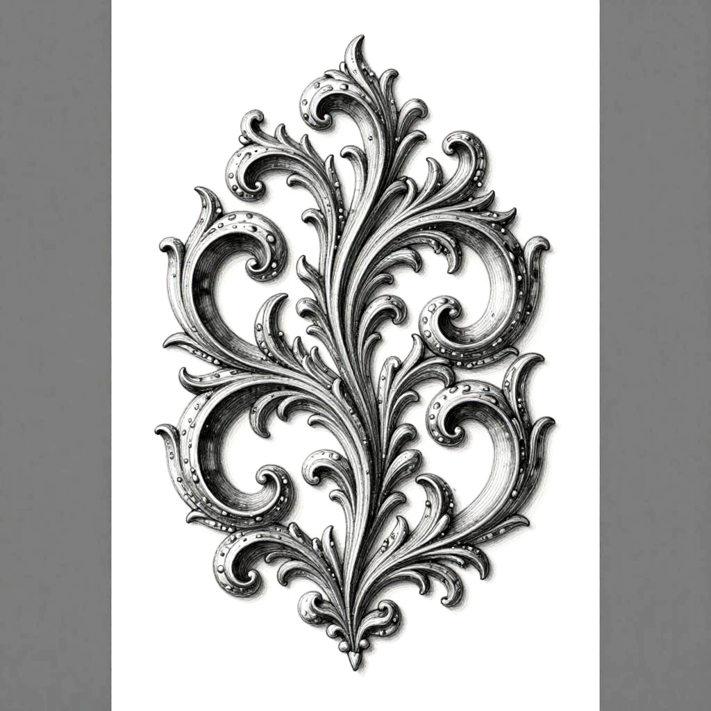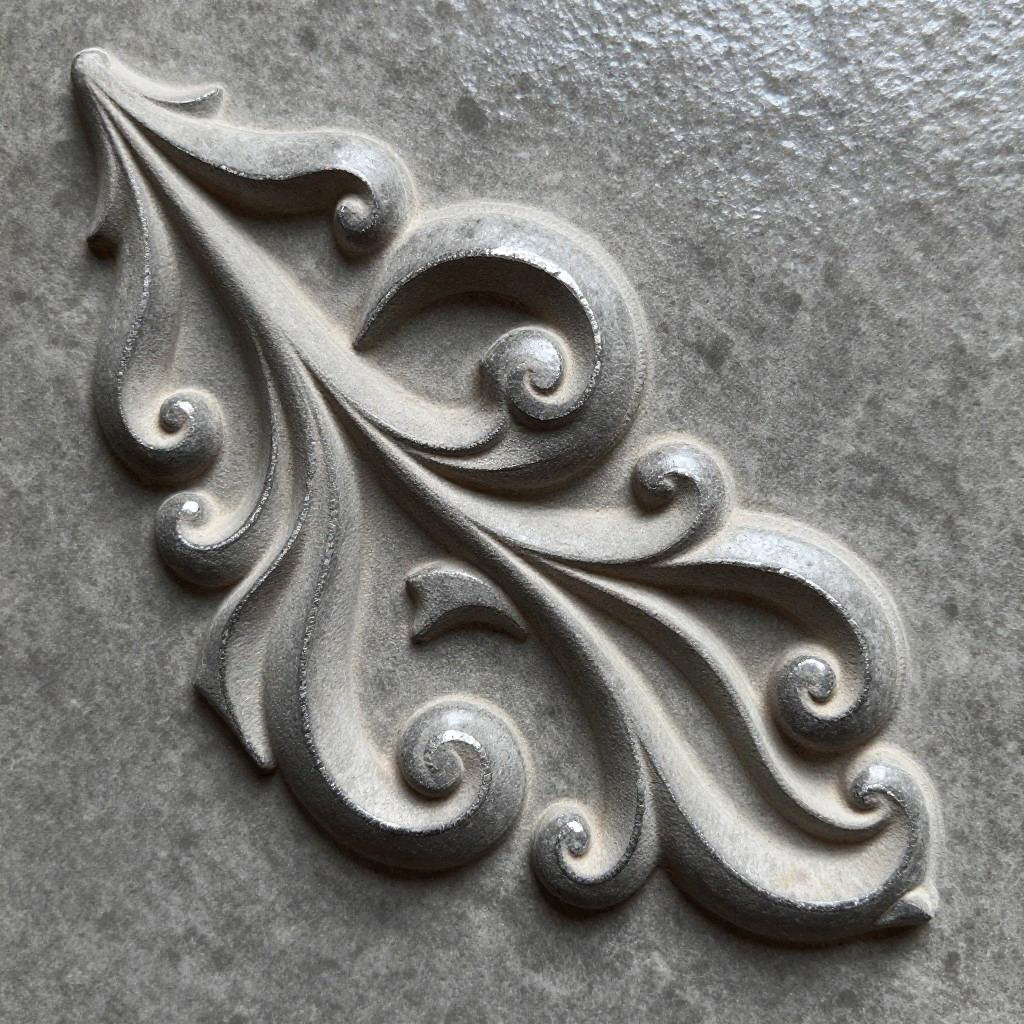 This is a close-up photograph of an intricately carved decorative corner piece. The design features elegant, swirling patterns with smooth, flowing curves in a grayscale texture, resembling a metallic or stone surface. The pattern is centered in the top left corner, with the background having a slightly textured, reflective finish. The overall style is ornate and traditional.