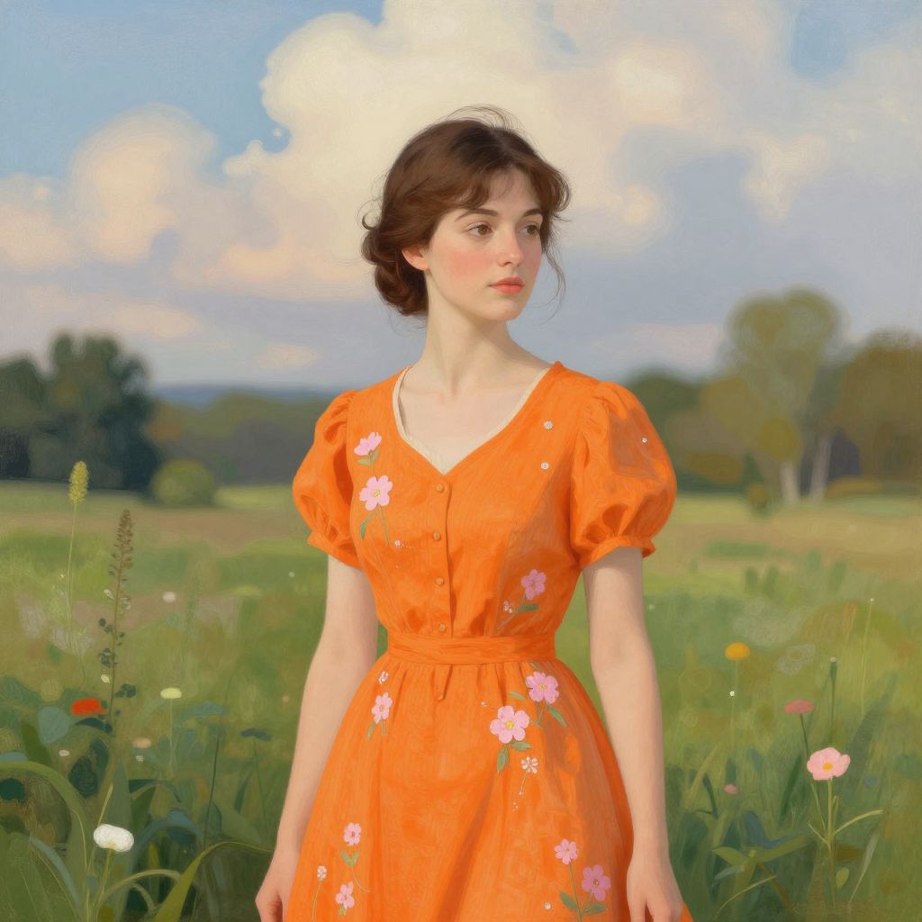 Digital painting of a fair-skinned woman with brown hair in a braid, wearing an orange floral dress, standing in a sunlit meadow with