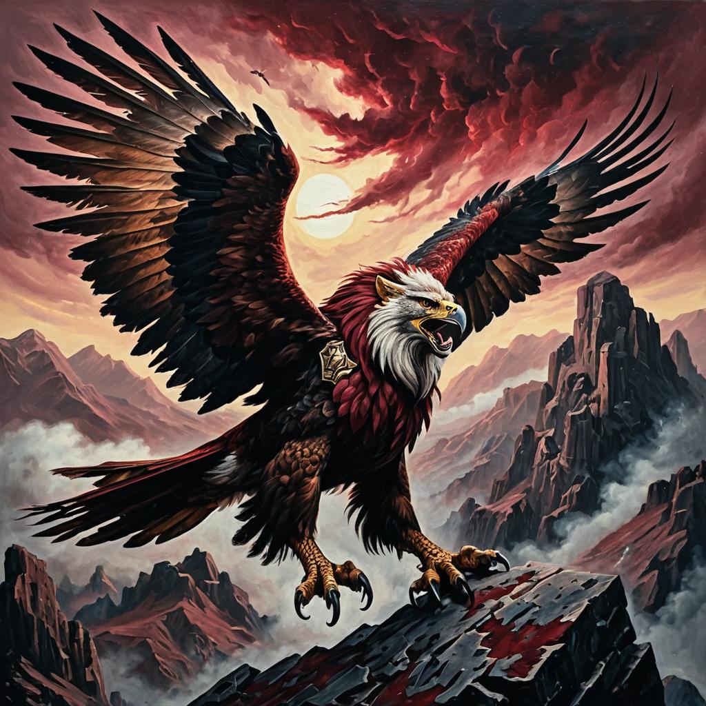 Warhammer fantasy RPG style oil painting of majestic griffon flying in sky, lion body with eagle head, burgundy and ash colors, smoky twilight ambiance, rich and textured oil painting