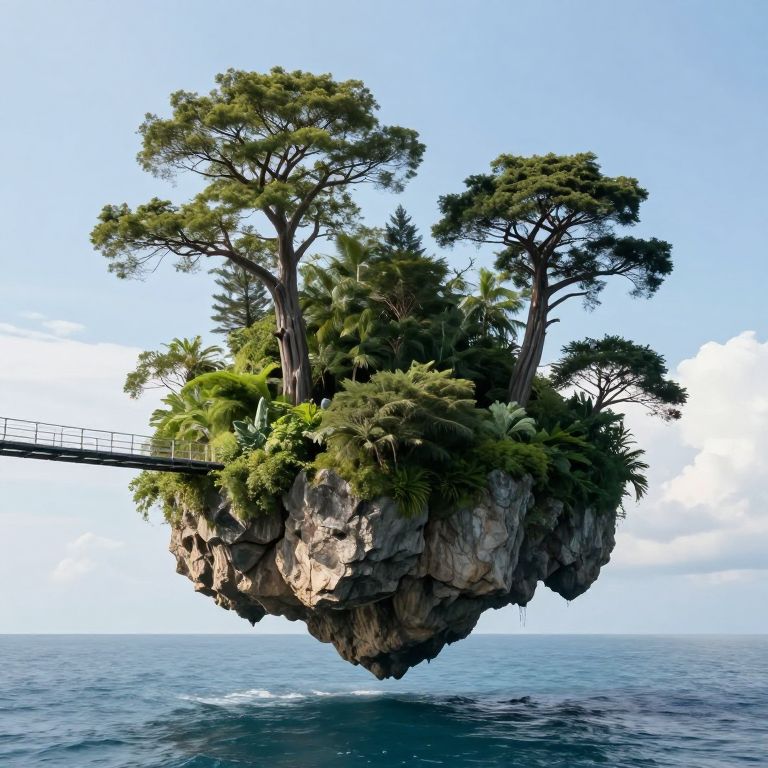 A serene island floats effortlessly above the ocean, its rocky base suspended mid-air, while lush greenery and towering trees defy gravity, creating a surreal bridge between earth and sky.