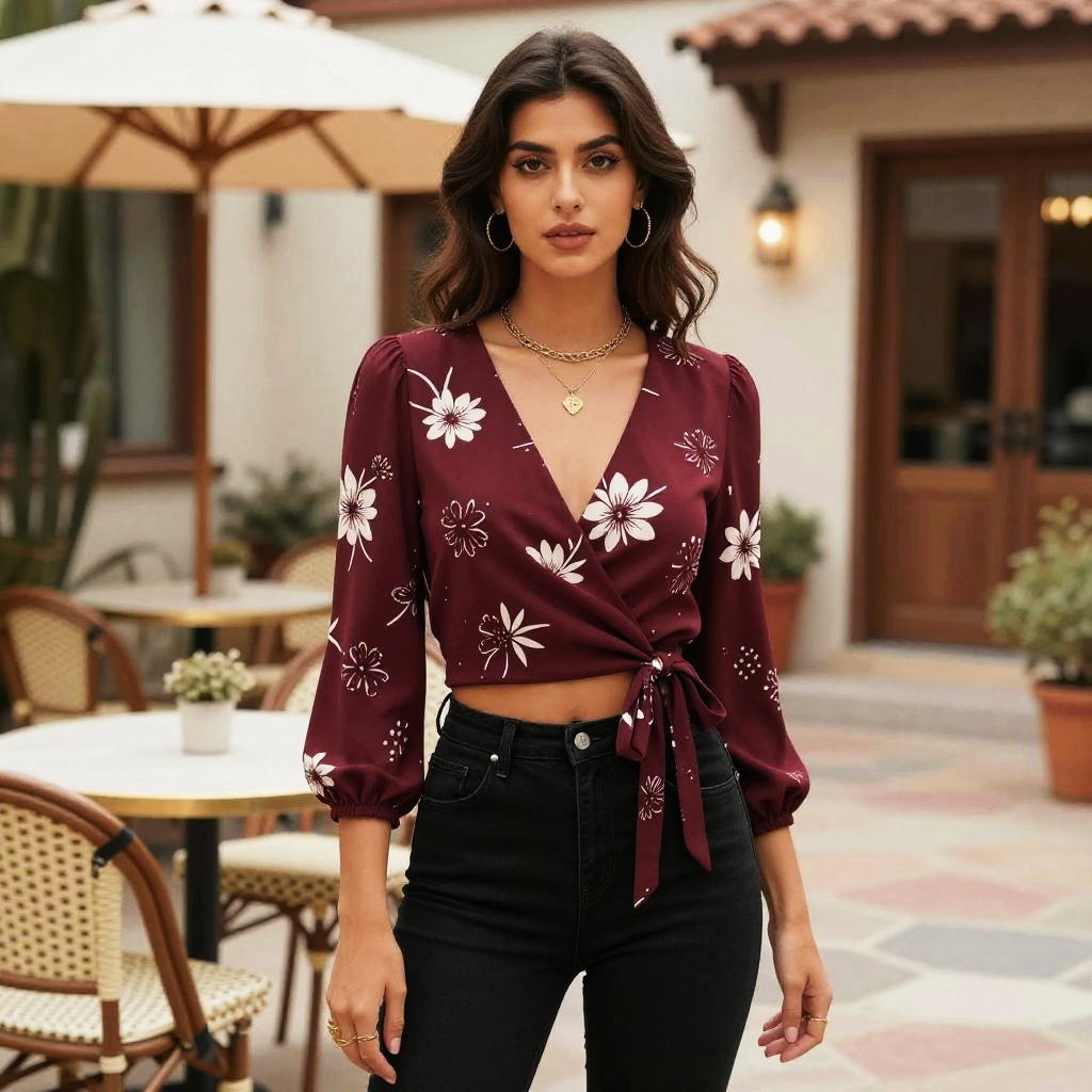 Photograph of a confident woman with long brown hair, wearing a light purple wrap top and white high-waisted pants, standing in an outdoor café