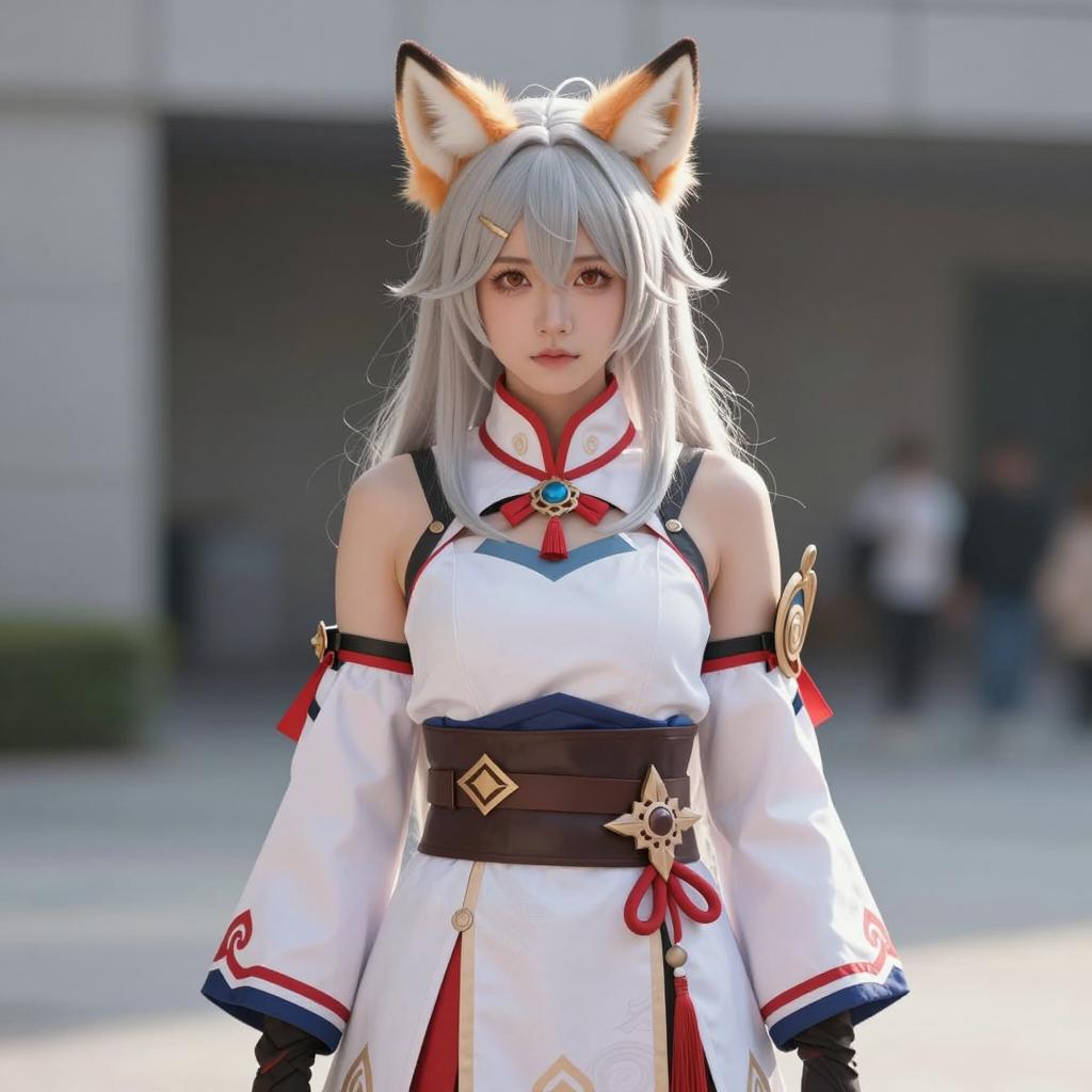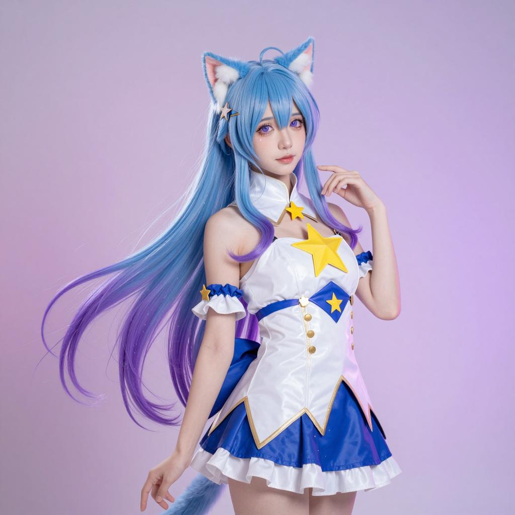 Lucky star konata cosplay, anime-style photograph, female cosplayer, long blue-purple hair with cat ears, white and blue outfit, yellow star on chest, starry pink-purple gradient background, soft lighting, standing pose, detailed hair and clothing, ethereal and magical atmosphere