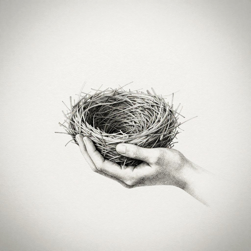Fox carefully holding wild mushrooms, rendered in detailed ink stippling with crisp flowing lines, subtle crosshatching, and fine texture; elegant negative space and balanced asymmetry; soft vignette, crisp silhouette, and restrained detail on rough handmade paper; set against a calm uncluttered backdrop, cool ambient light, quiet contemplative mood; timeless craftsmanship, gallery presentation feel, cohesive minimal composition, refined simplicity.