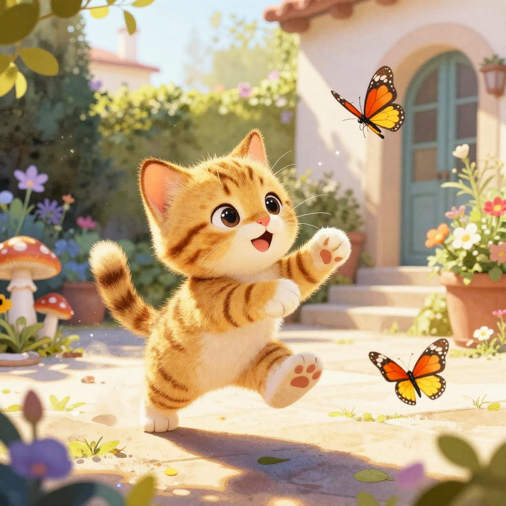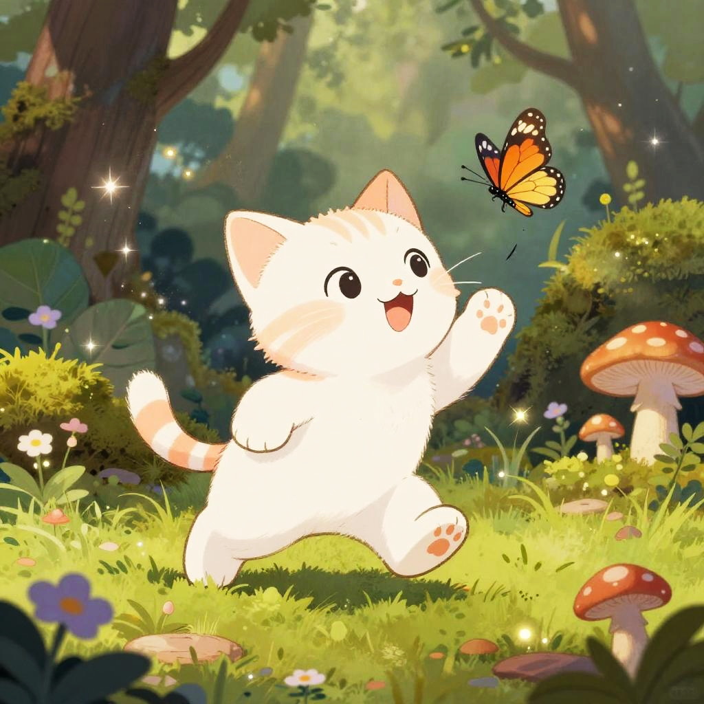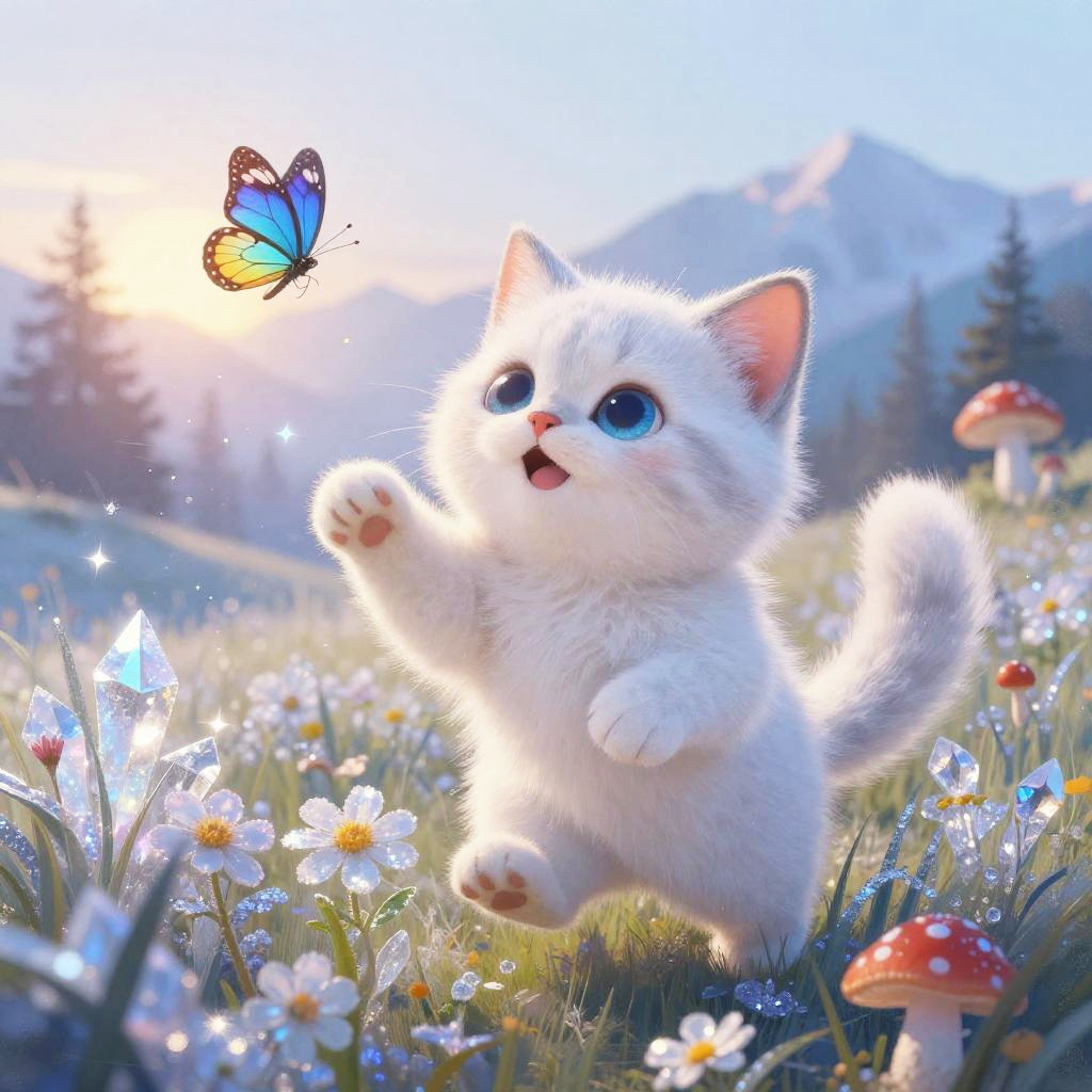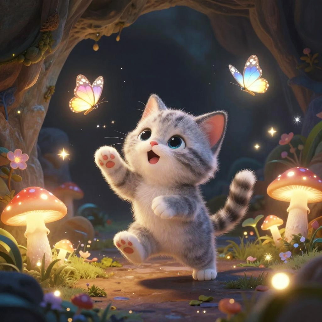 Fluffy calico kitten cartoon playfully chasing butterflies through mystical crystal cave glowing with light, among sparkling flowers and bioluminescent mushrooms; gouache and ink with bold outlines, soft outlines, tactile textures, expressive eyes, joyful fantasy atmosphere, luminous glints, gentle rim light, volumetric glow, subtle fog, dynamic motion lines, balanced composition, shallow depth of field, ambient occlusion, soft vignette, ultra-detailed, high resolution.