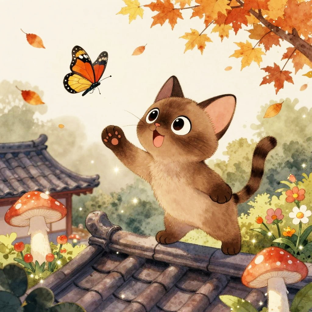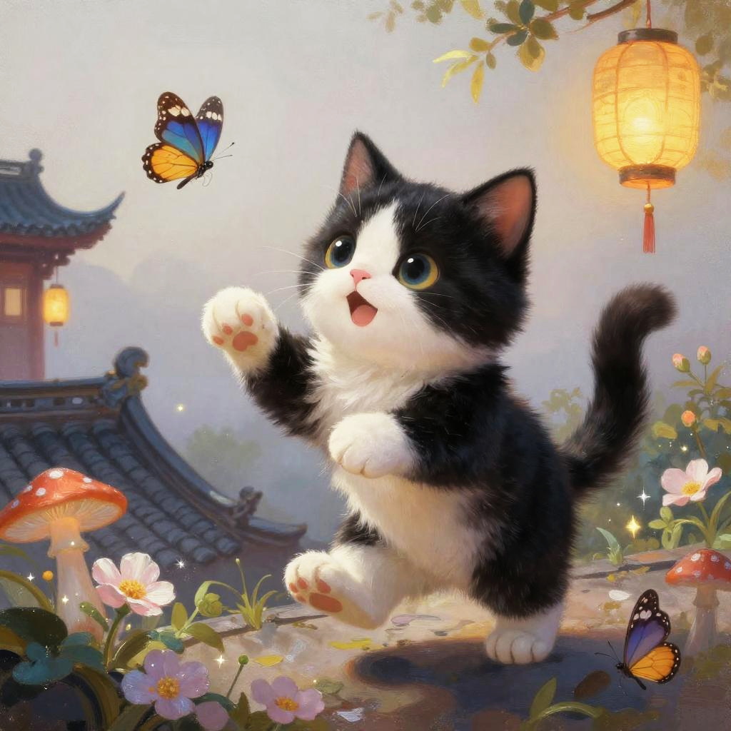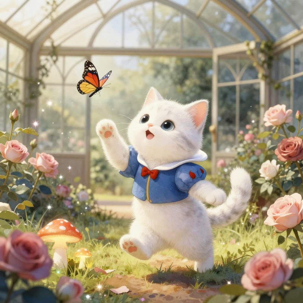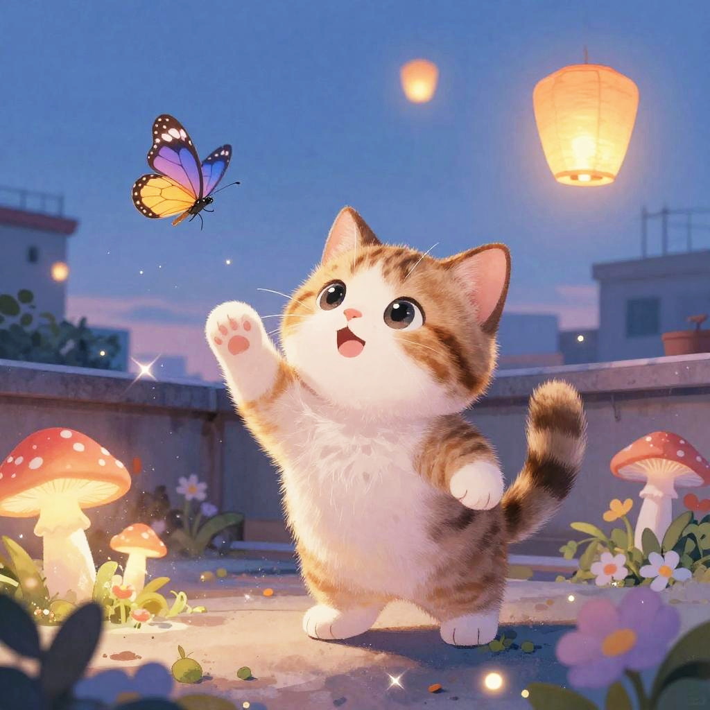 Fluffy calico kitten cartoon playfully chasing butterflies through mystical crystal cave glowing with light, among sparkling flowers and bioluminescent mushrooms; gouache and ink with bold outlines, soft outlines, tactile textures, expressive eyes, joyful fantasy atmosphere, luminous glints, gentle rim light, volumetric glow, subtle fog, dynamic motion lines, balanced composition, shallow depth of field, ambient occlusion, soft vignette, ultra-detailed, high resolution.