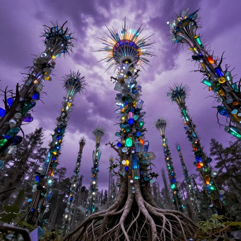 A towering forest made entirely of chromatic glass grows upside down in a violet sky, roots bursting from the clouds like crystalline stalagmites that hum with ancient solar songs.