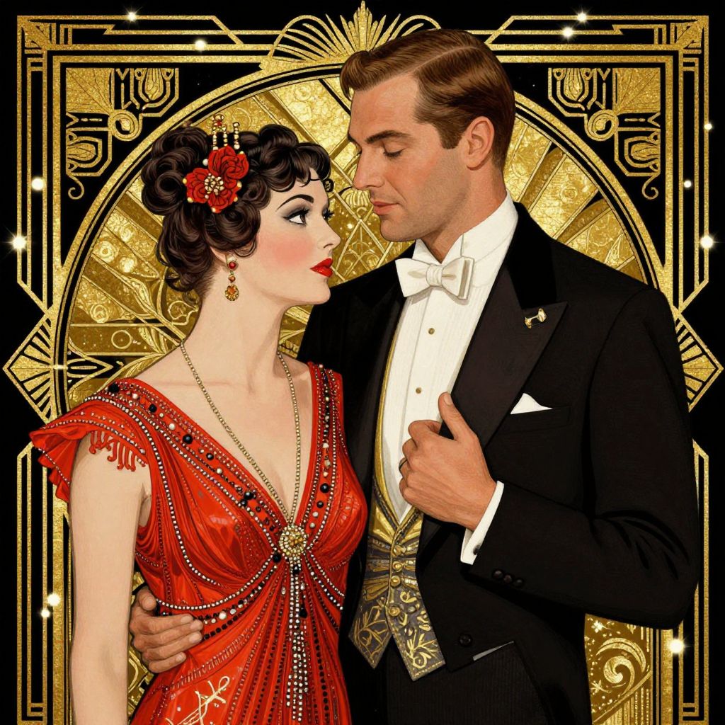 A glamorous illustration in a vintage Art Deco style depicts a couple dressed in formal attire, with the woman in a red dress adorned with intricate beadwork and the man in a classic black tuxedo, set against an ornate gold-and-black decorative frame reminiscent of \"The Great Gatsby.\