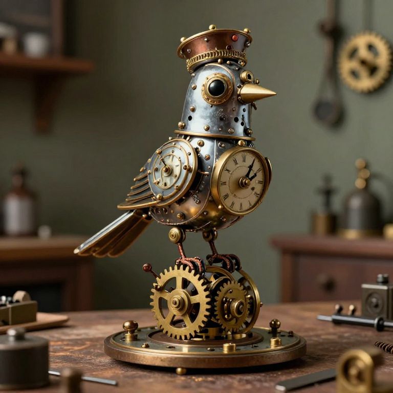 Kuki, a charming steampunk-inspired mechanical bird perched on a vintage clockwork mechanism, detailed with brass gears and rivets, set in an old workshop filled with tools and inventions, capturing a sense of creativity and imagination.