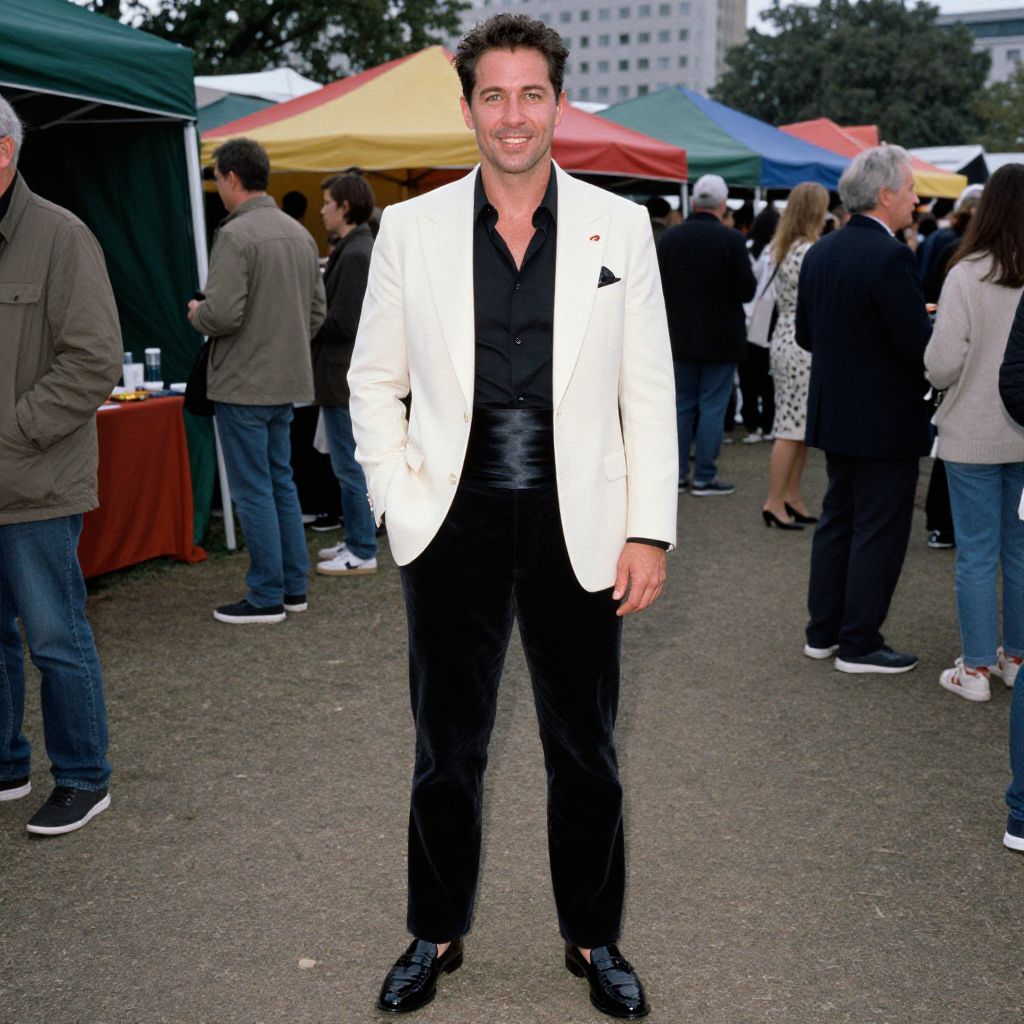 A man, ivory dinner jacket, black dress shirt, black silk cummerbund, black velvet trousers, patent leather loafers, colorful tents, bustling crowds, kodak sp analog photo, confident smile, warm ambiance. Man has masculine face and piercing eyes