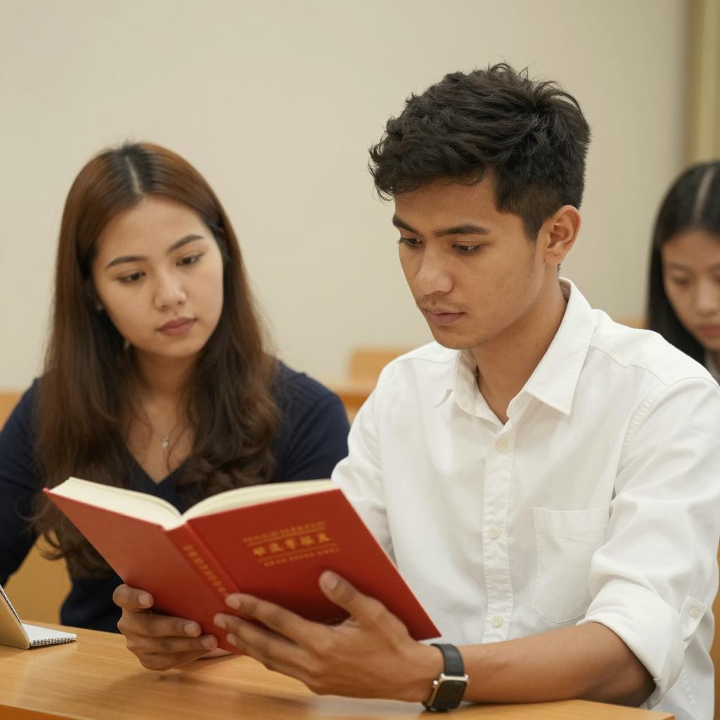 A hallway with four people. Man in white shirt and black pants walks left, woman in white pants and hoodie holds small child's hand, child in red and white dress walks ahead. Large camera equipment on right. Bright overhead lights. Blue door on left. Corridor floor has blue and white tiles.