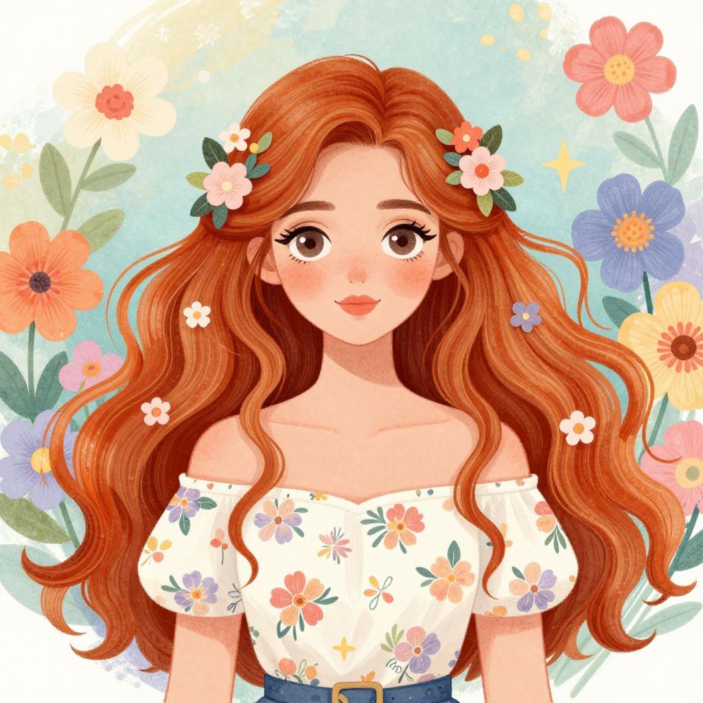 This is a digital illustration of a young woman with long, wavy red hair adorned with small flowers. She has fair skin, large brown eyes, and a gentle smile, with light blush on her cheeks. She wears an off-the-shoulder white blouse with a floral pattern and a blue waistband. The background features a pastel-colored, abstract floral design with various flowers and leaves in pink, orange, blue, and green. The illustration has a soft, whimsical style with vibrant colors and smooth textures, evoking a playful and feminine aesthetic.