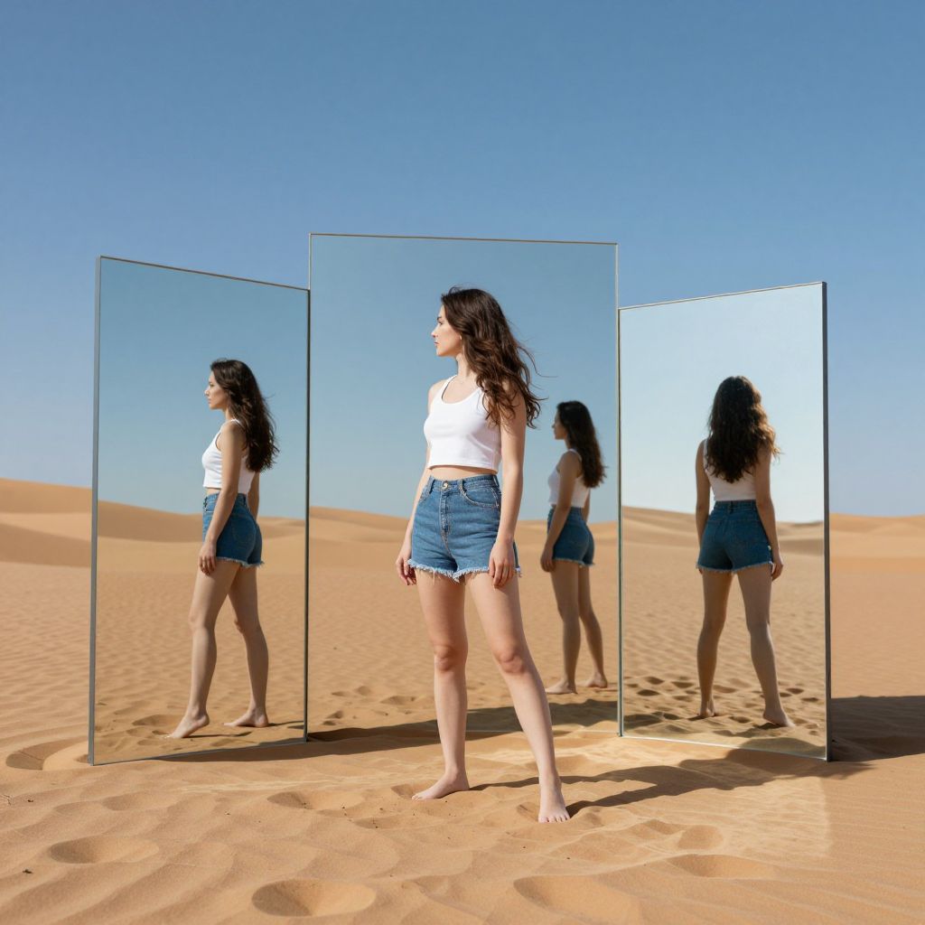 Woman standing barefoot in a desert landscape, surrounded by three large mirrors reflecting her image, creating a surreal scene where her mirrored reflections appear as if gazing back at her against the backdrop of a clear blue sky and sand dunes.