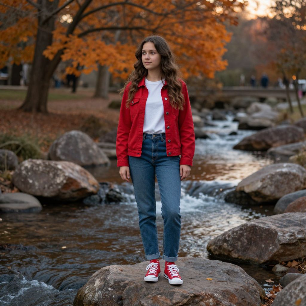 A young woman with long wavy hair and a serene expression stands on a large rock beside a flowing stream in a peaceful park during autumn. She wears a red denim jacket, white t-shirt, blue jeans, and red sneakers. The background features autumnal orange foliage, smooth rocks in the water, and soft twilight lighting, creating a calm and natural outdoor setting.