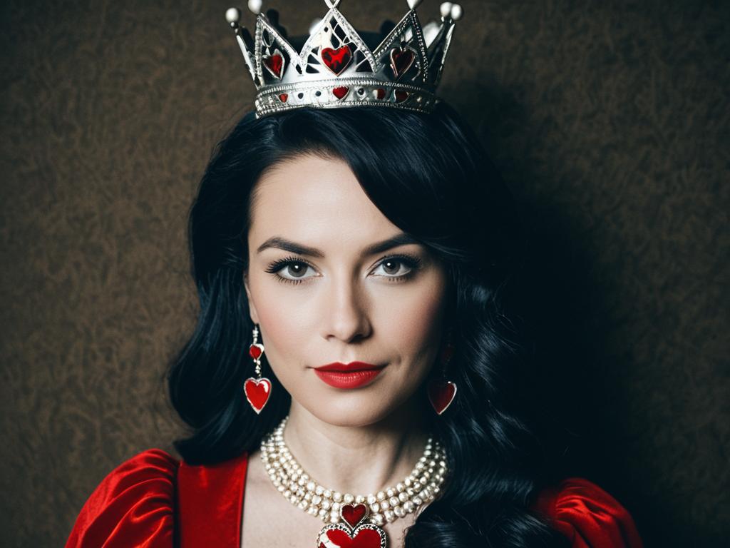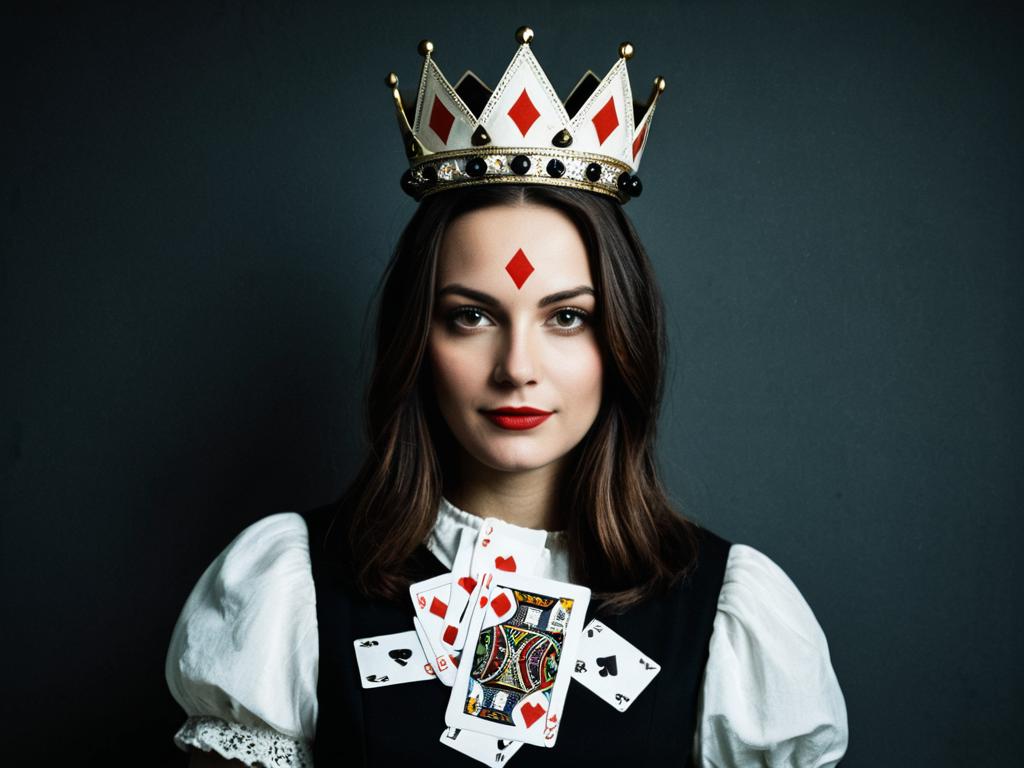 Playing Card Costume Adults face swap, image of a woman in a dress and crown holding a playing card