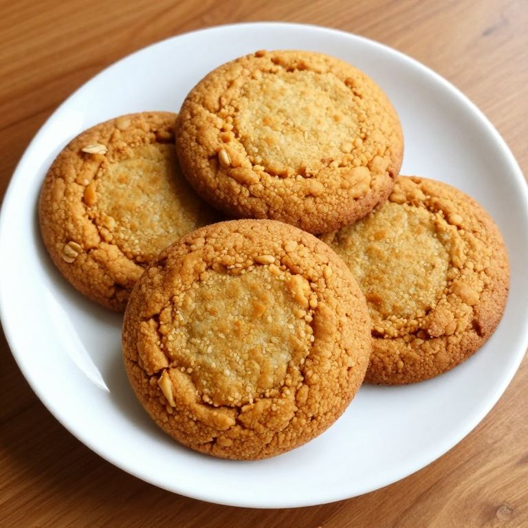 Four Pumpkin Oatmeal Cookies, arranged in a cluster on a white plate with a subtle textured rim, rest atop a warm wooden table, showcasing their golden-brown hue and slightly crumbly texture.