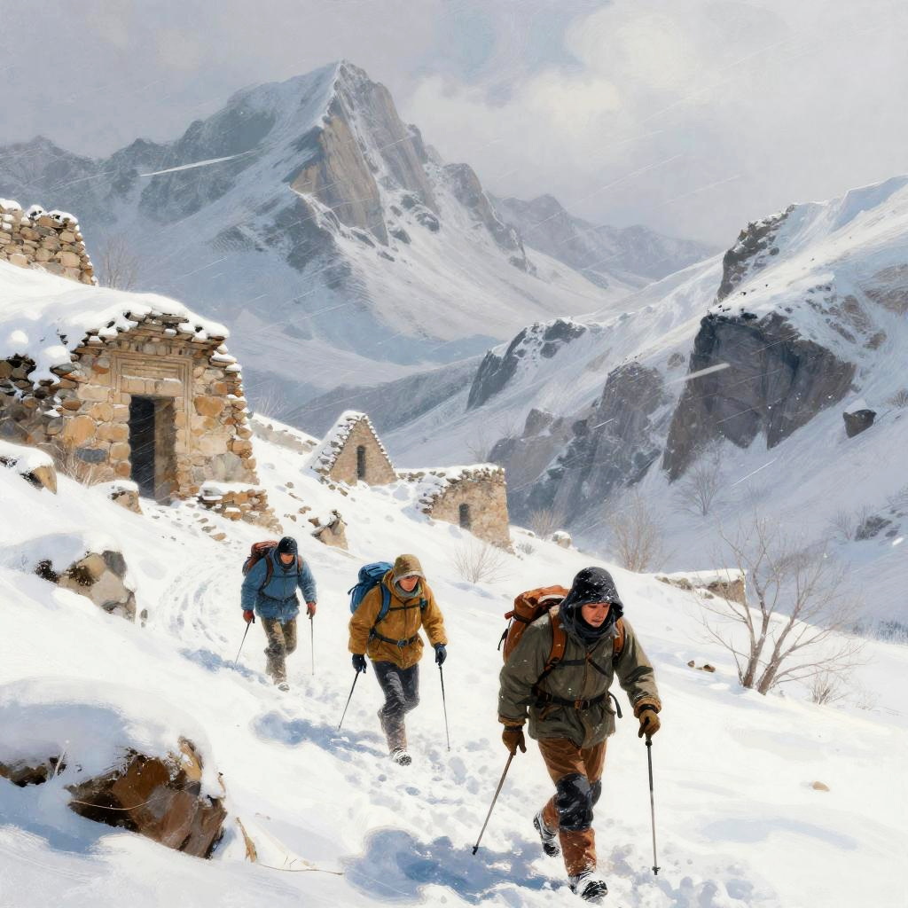 Tintins trekking through a snowy mountain range, harsh winds blowing snow, characters bundled up in winter gear, ancient ruins partially buried in snow, cold color tones with soft highlights, painterly style blending realism and fantasy.