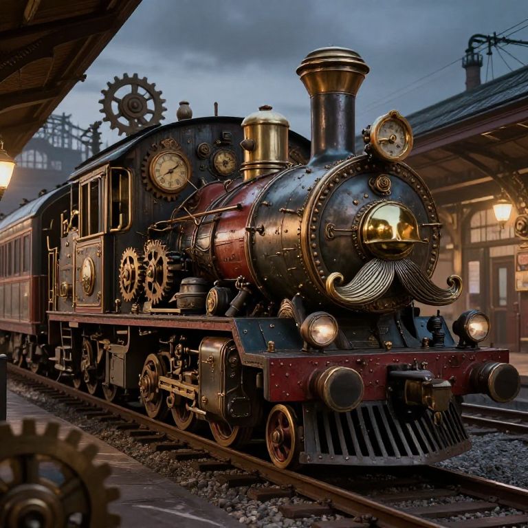 Train mustache: a surreal steampunk train station where all the trains feature exaggerated ornate metallic mustaches on their fronts, surrounded by intricate mechanical gears and clockworks, dusky twilight sky, richly detailed environment, imaginative fantasy art style