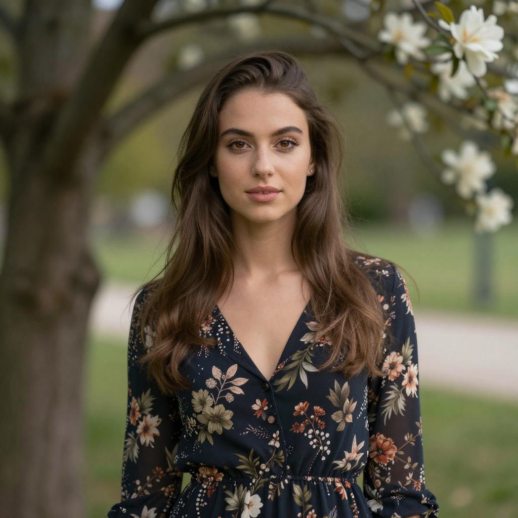 Portrait of a young woman with long brown hair and brown eyes wearing a dark floral print long sleeve dress, standing outdoors next to a tree with blurred green background and white flowers.