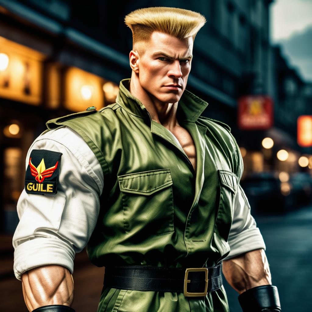 Guile from Street Fighter photographed on a Nikon, rendered in a photorealistic style. The image captures the character with lifelike detail, highlighting intricate textures and features of the military attire. The realistic lighting and high-resolution quality give the scene an authentic, cinematic feel, making the character appear as if they exist in the real world.