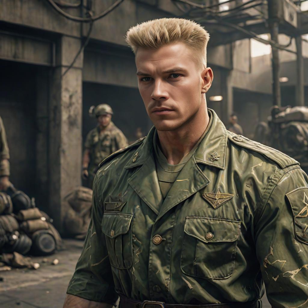 Portrait of a muscular soldier with a distinctive blonde flat top hairstyle dressed in a green military uniform with rolled-up sleeves and wrist guards. The background suggests a military or training base with barrels and a rustic building.