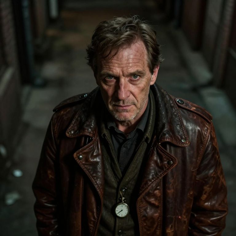 Imagine an ultra-realistic portrait of a seasoned detective, capturing the enigmatic gaze that hints at a sharp intelligence honed over years in the field. Bathed in the soft glow of a dimly lit alleyway, their weathered face is illuminated, revealing the intricate details of a life well-lived: the worn leather coat, the faint glint of a hidden pocket watch, and a world-weary expression that holds both experience and an unquenchable curiosity. From a bird's-eye view, the scene takes on an intimate closeness, as shadows dance across their features, adding depth to the subtle shifts in their expression. This portrait invites viewers into a captivating exploration, not just of the detective's mind but also of the atmospheric environment they inhabit.