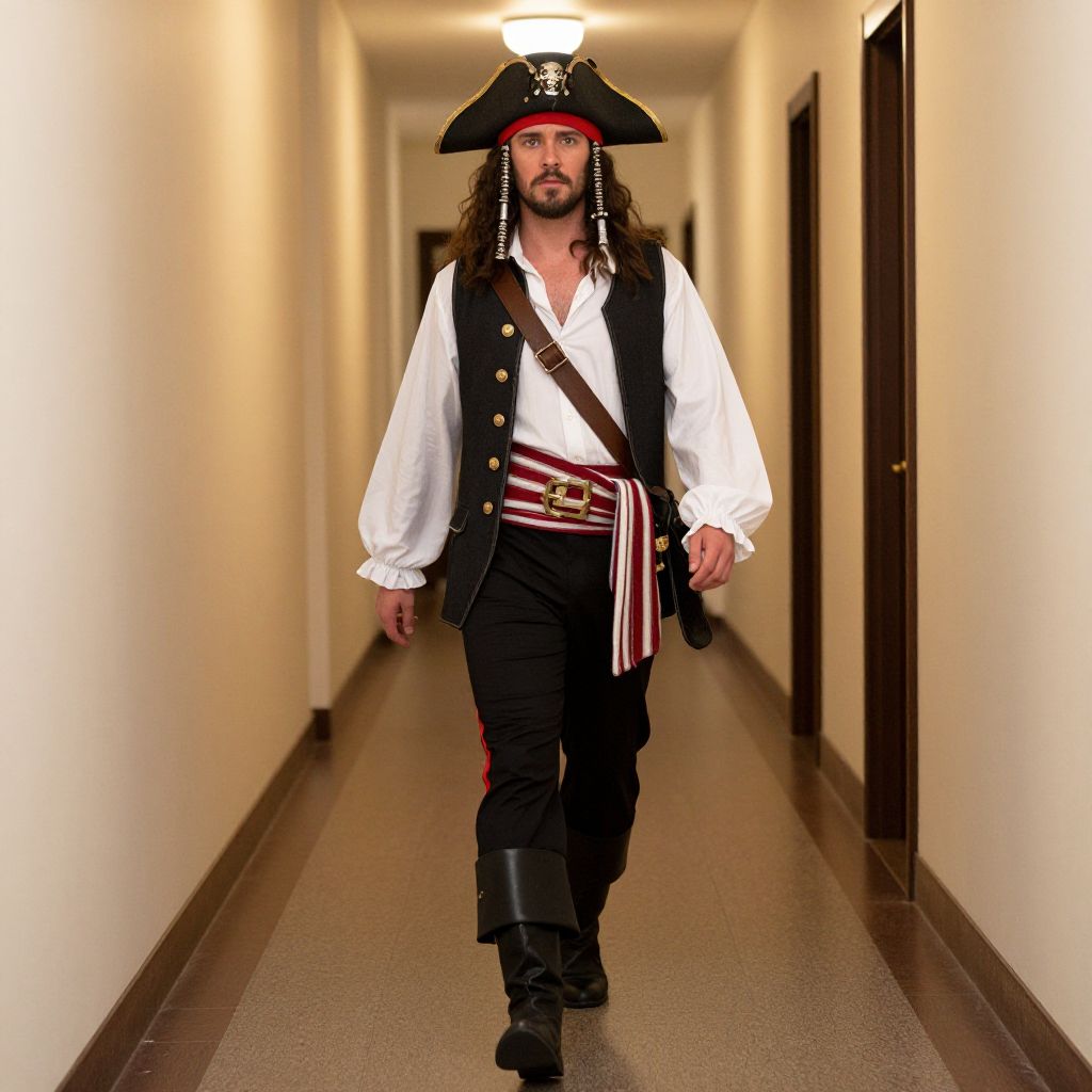 Firetrap Costume, man in a pirate costume walking down a hallway