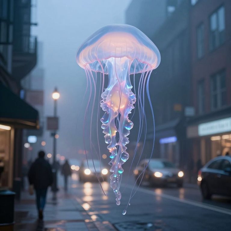 Photograph of a glowing, translucent jellyfish floating in a foggy urban street at twilight, with blurred pedestrians and streetlights in the background.