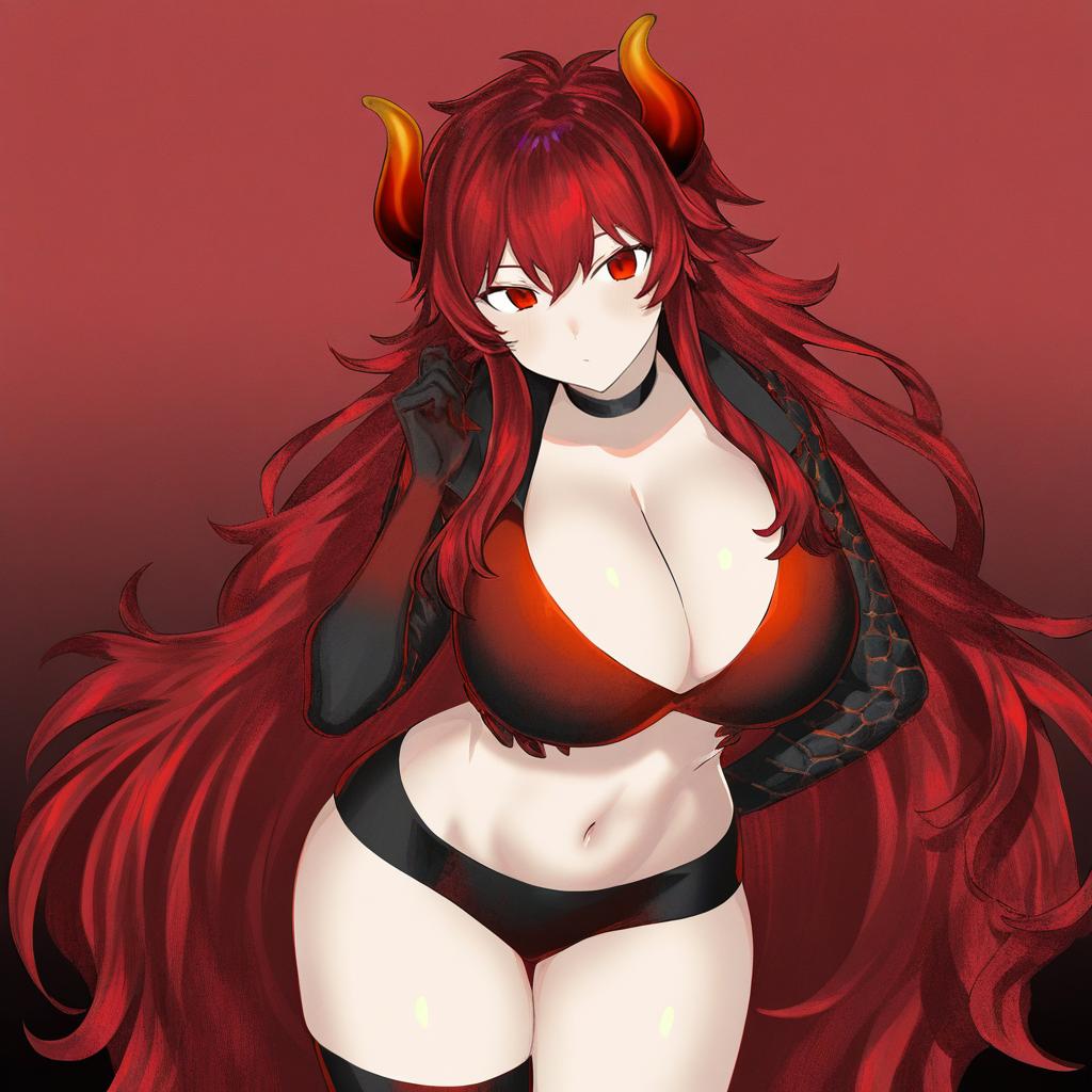 Dola (nijisanji), nijisanji, 1girl, dragon horns, dragon tail, red eyes, hair between eyes, red hair, long hair, very long hair, large breasts, huge breasts, cleavage, navel, virtual youtuber, virtual youtuber, dragon girl, by artist arizuka (catacombe), leet